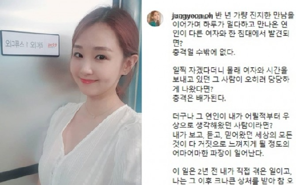 강타와 정유미는 친한 동료 사이라며 열애설을 부인했는데 갑자기 방송인 오정연이 SNS에 강타와 우주안의 이름이 나온 캡쳐를 올리며 의미심장한 글을 올려 화제가 됩니다. 오정연이 강타와 교제하던 중에 강타와 우주안이 바람피우는 장면을 직접 목격했다는 충격적인 폭로였습니다.